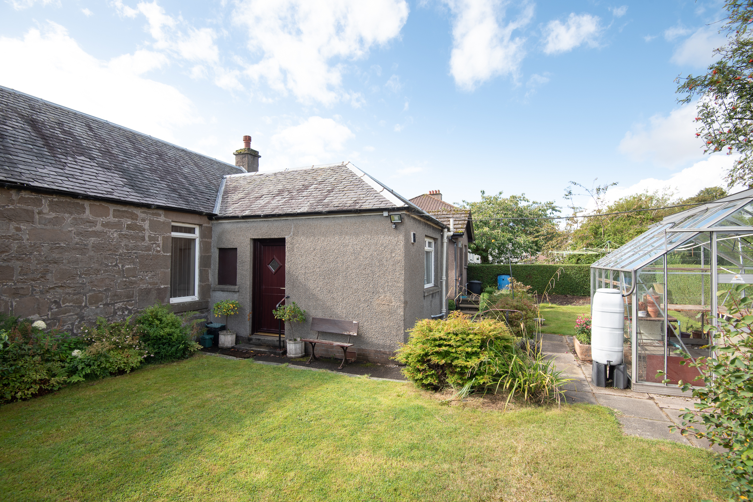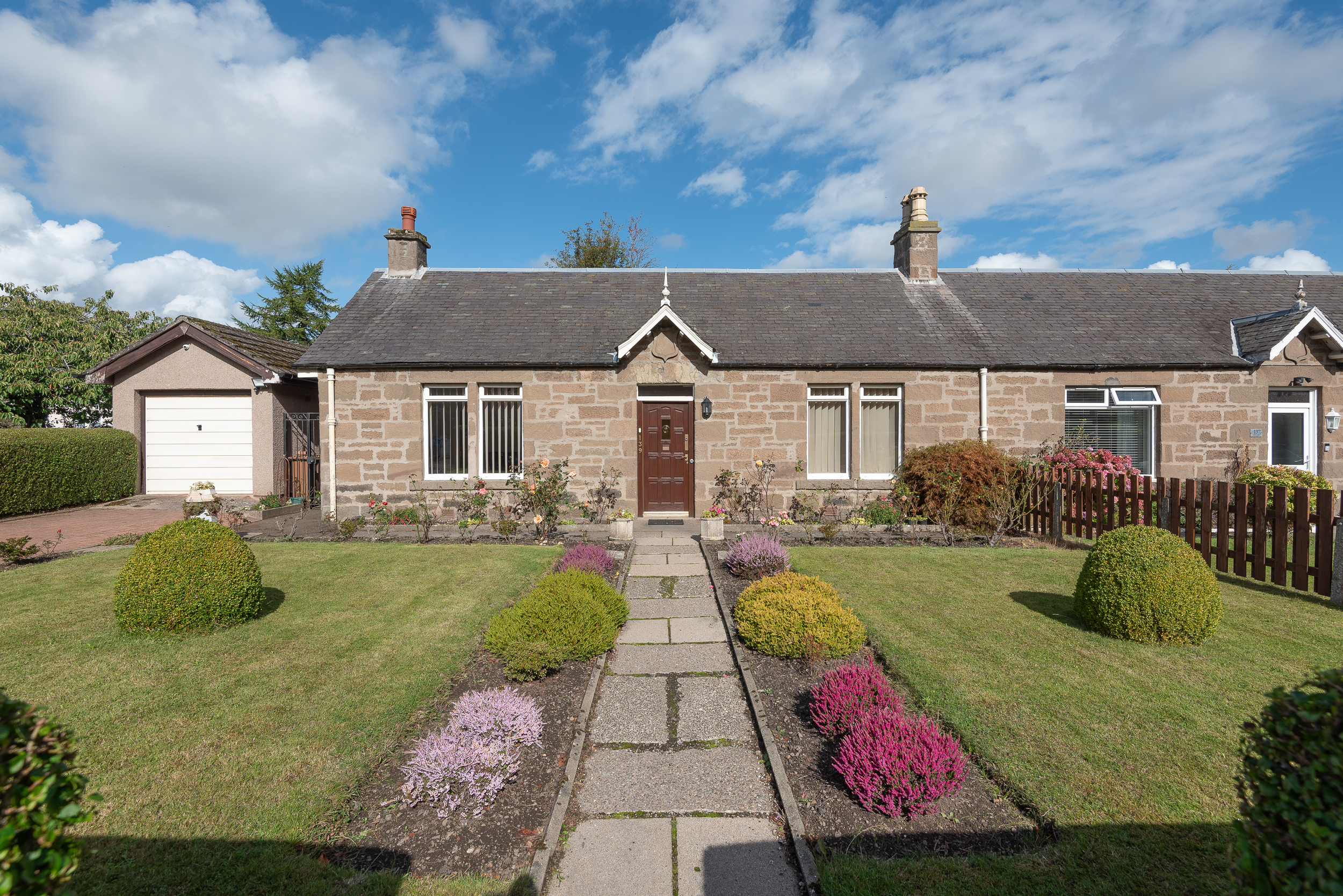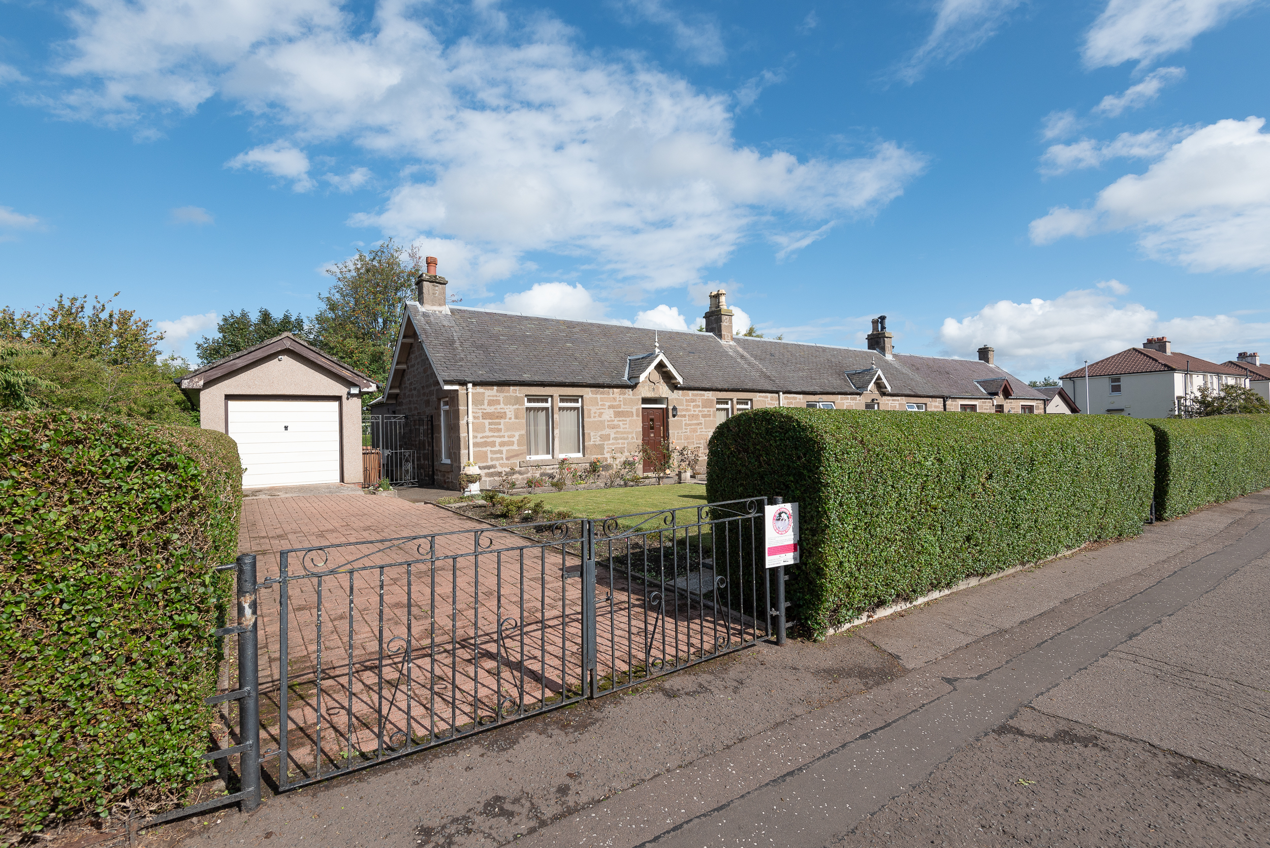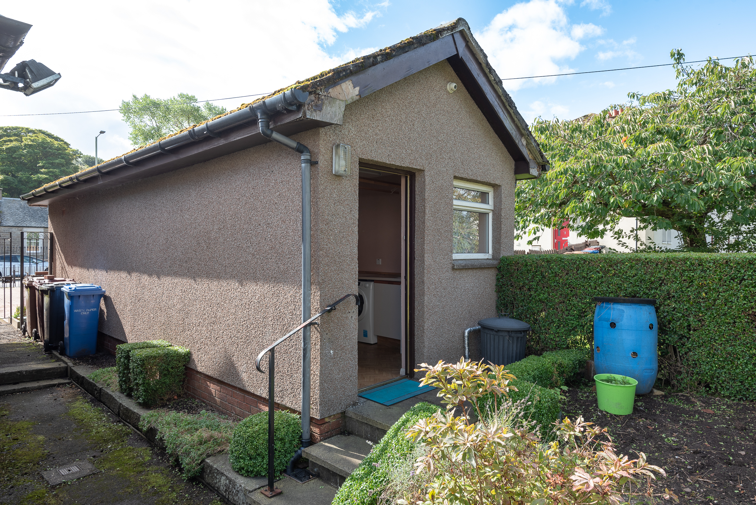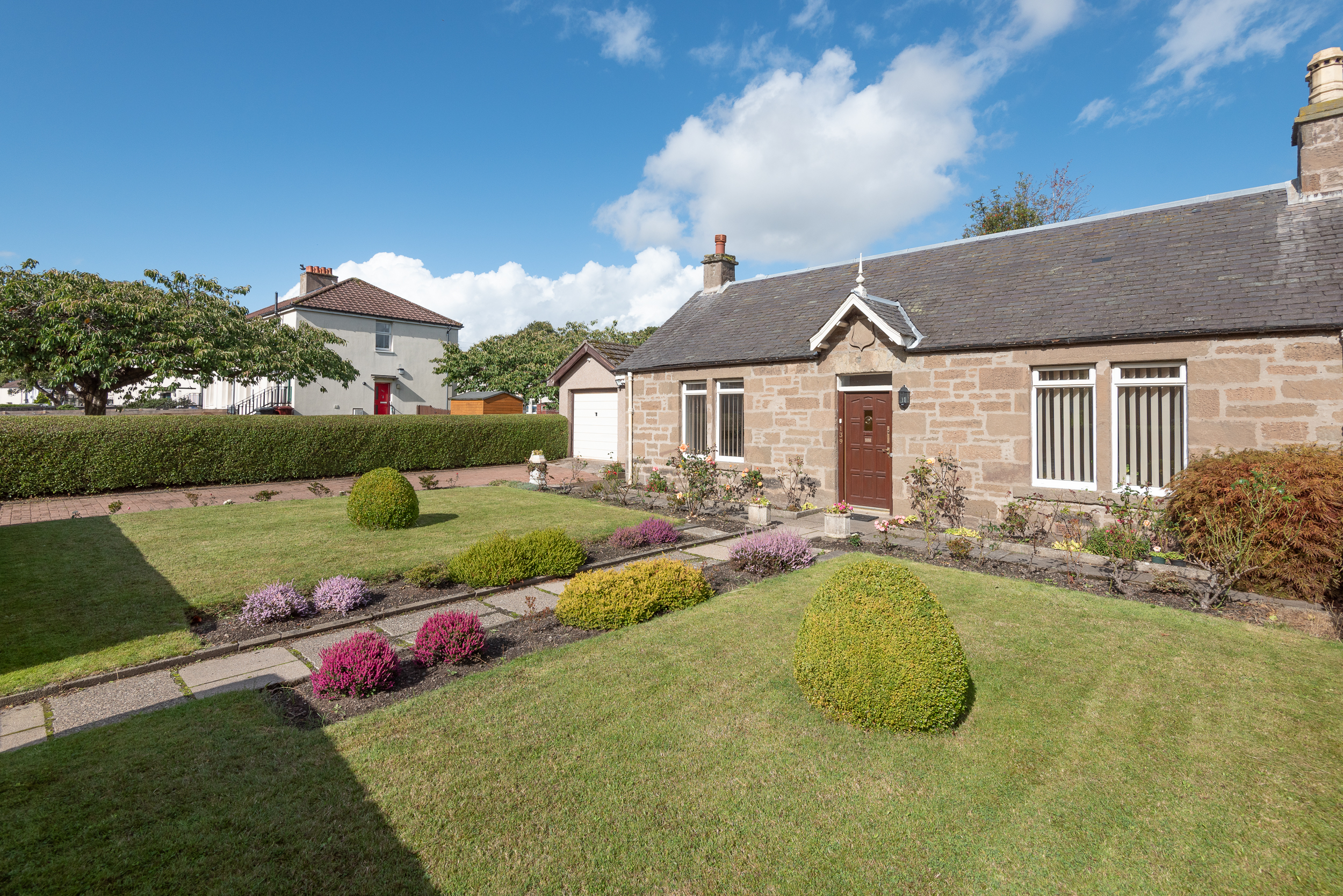 The property is accessed via a private tarmac drive at the front, with a garden area laid in grass and shrubbery, including a slabbed path leading to the front entrance door.