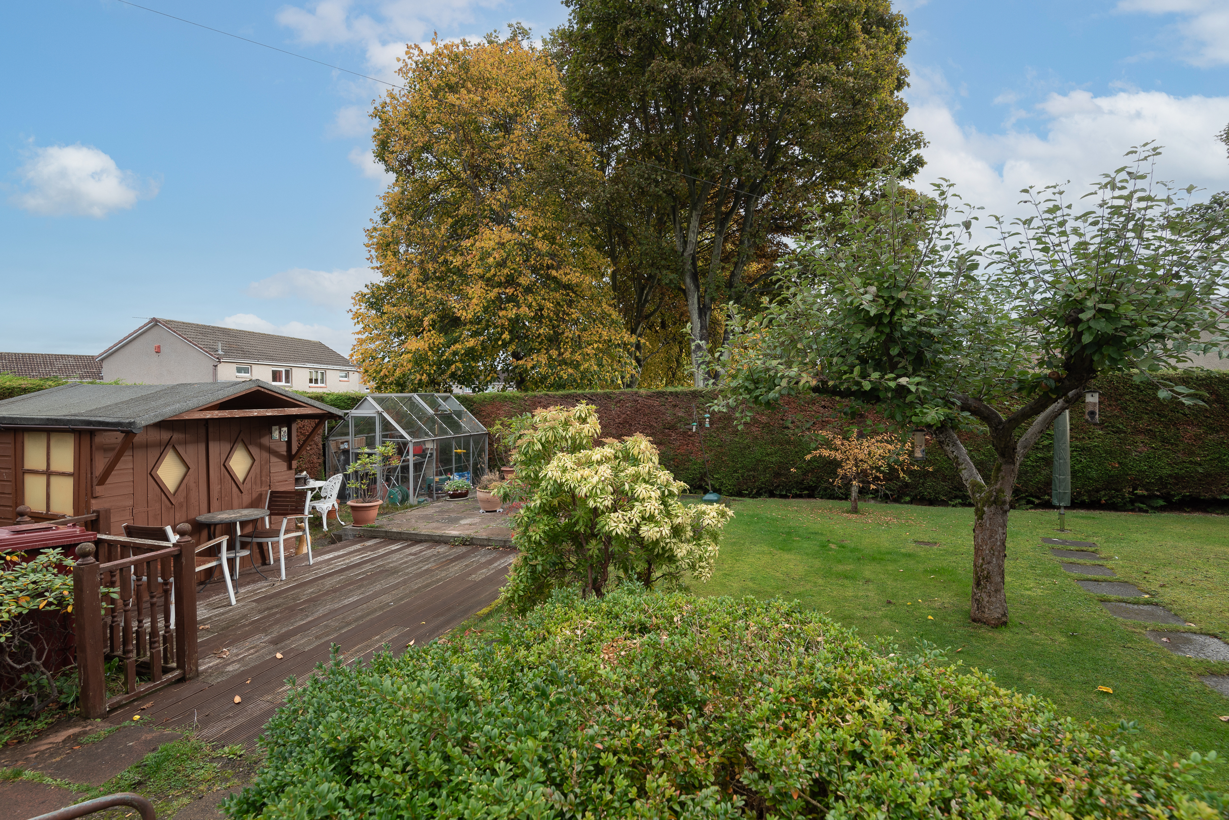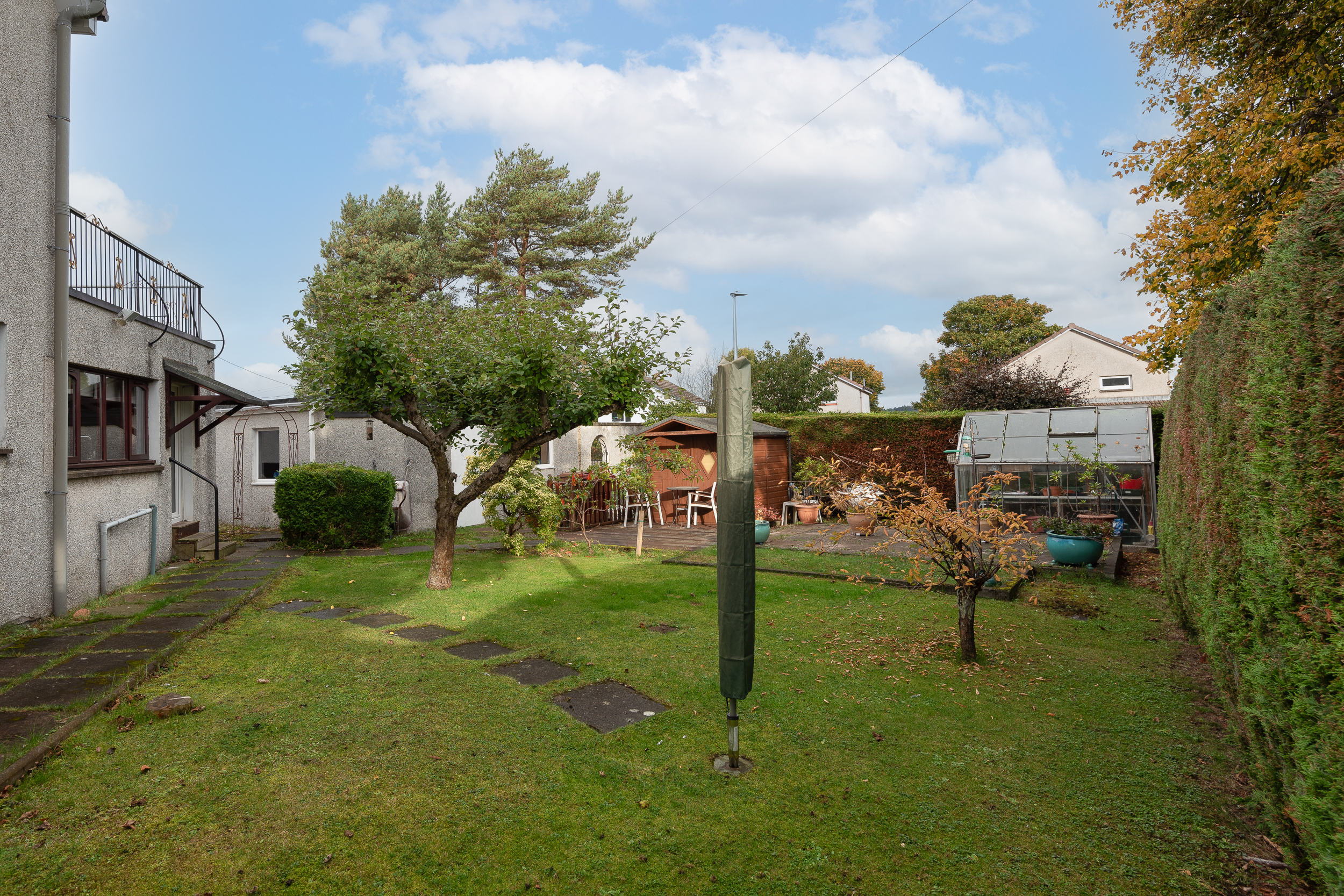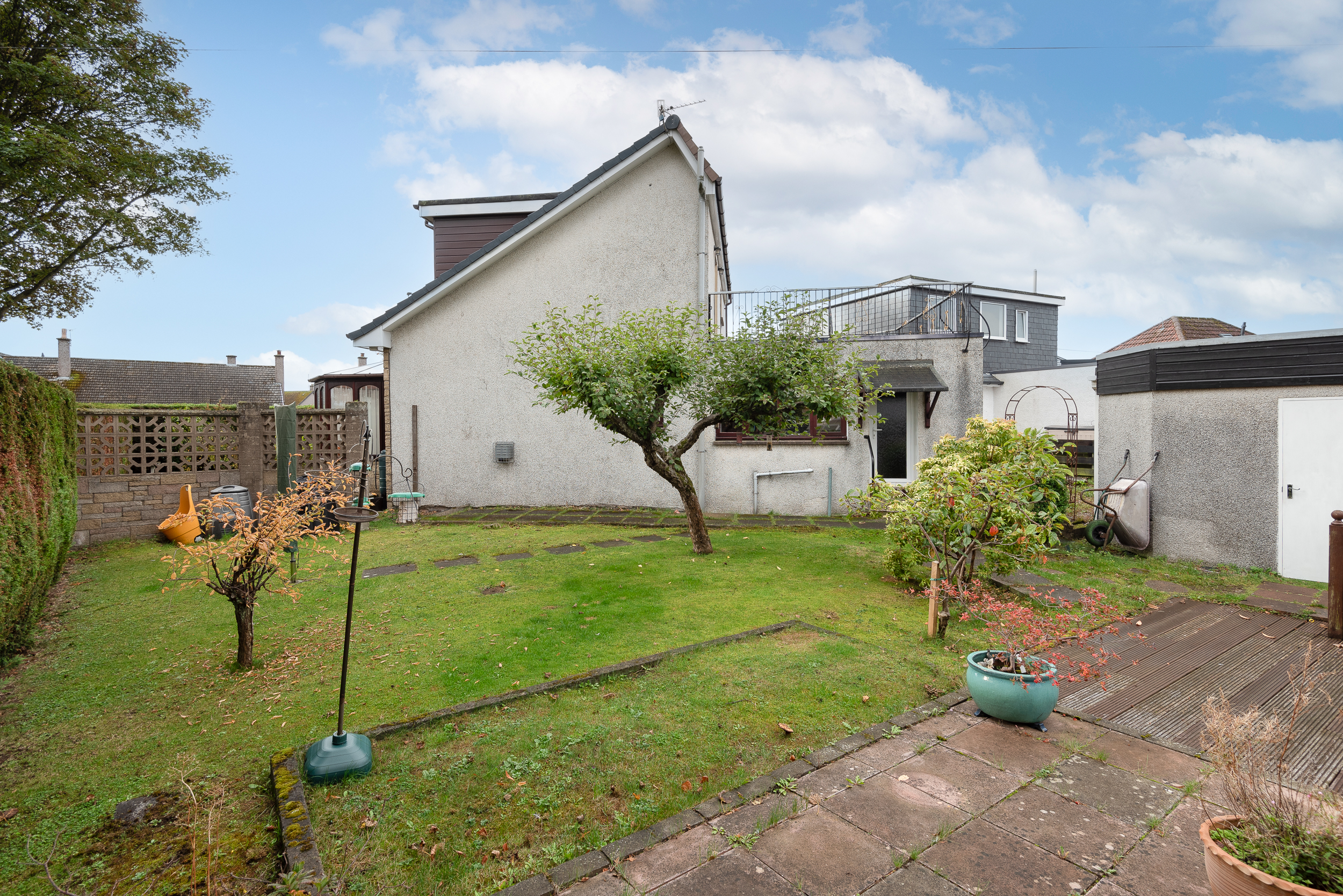 The property forms part of a mature, angular plot with gardens located to the front, side and rear elevation. Parking is available in front of the garage, accessed via Rossie Avenue. The gardens are of a mature design, predominantly laid to grass, with a paved patio and timber decking, along with mature trees and shrubbery. Outbuildings comprise a garden shed and greenhouse.