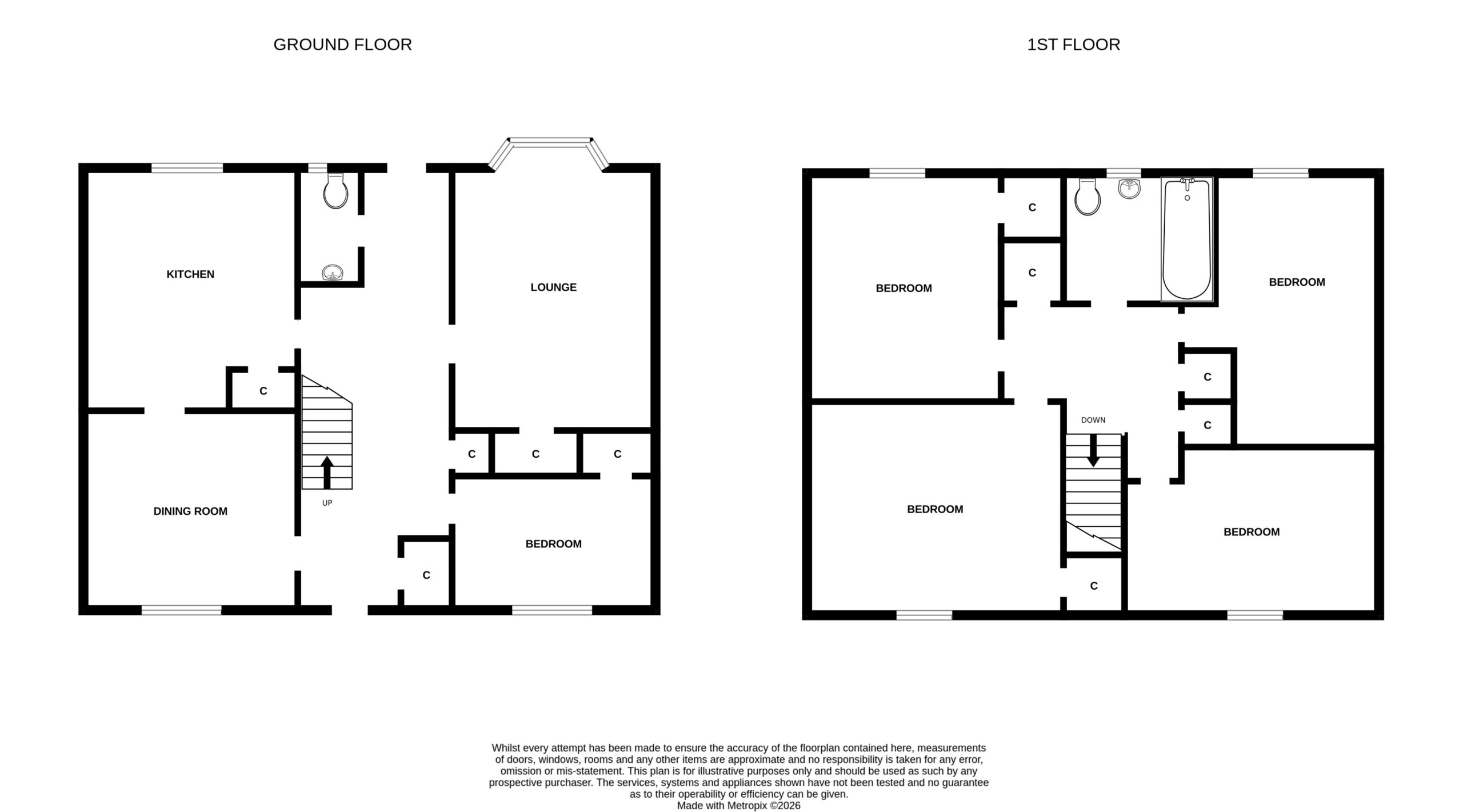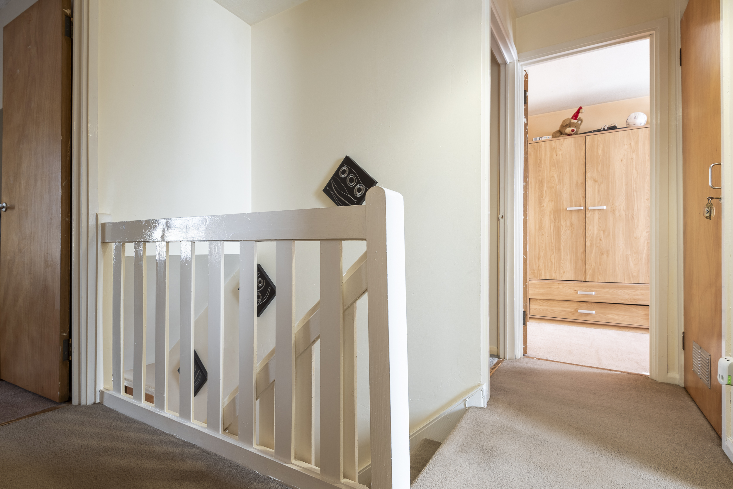 On the upper level, there are various storage cupboards within the hallway and access to floored attic. Four further bedrooms, all well-proportioned and two benefit from having fitted stores. The bathroom is fitted with a three piece white suite, having electric shower over the bath and folding shower screen.