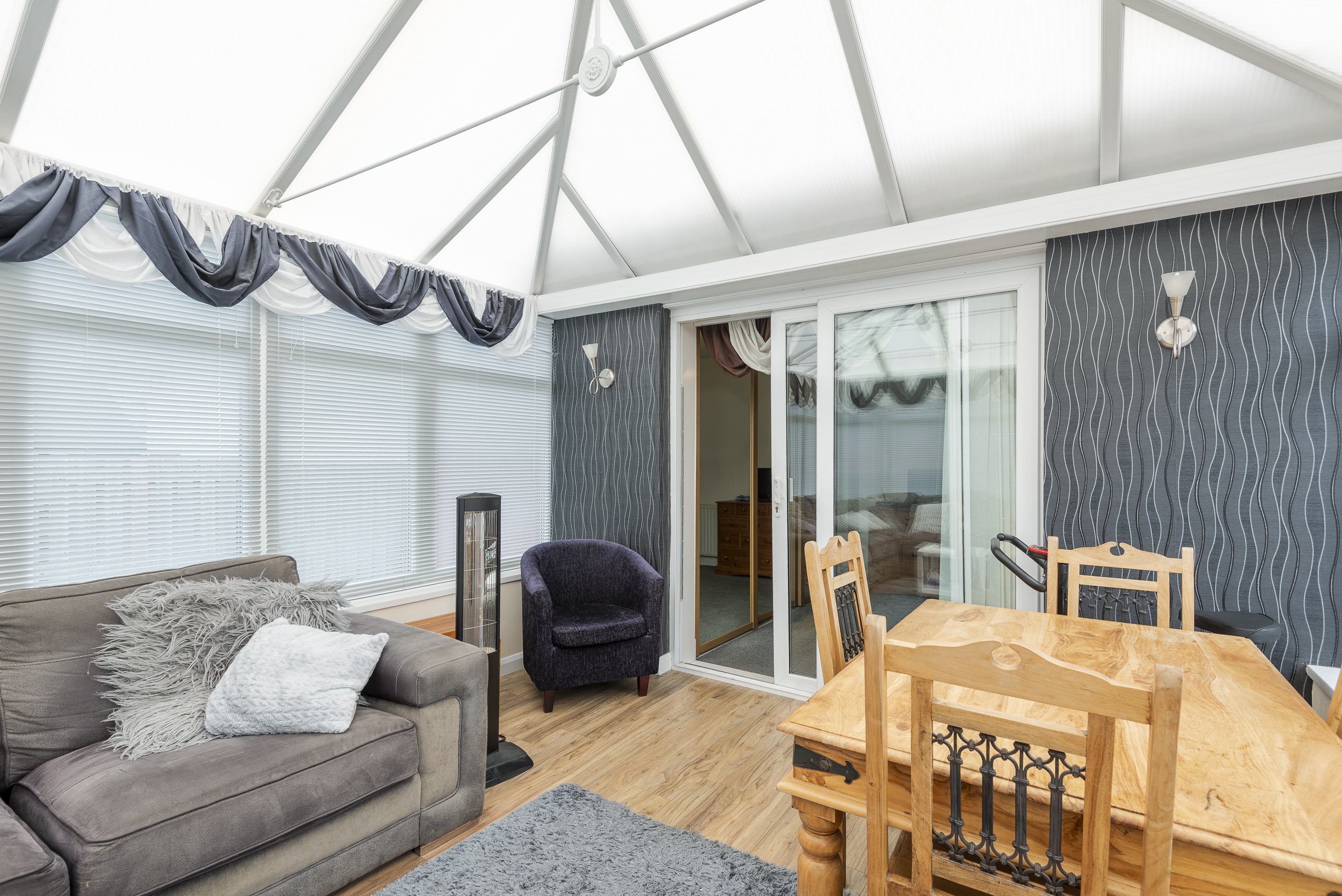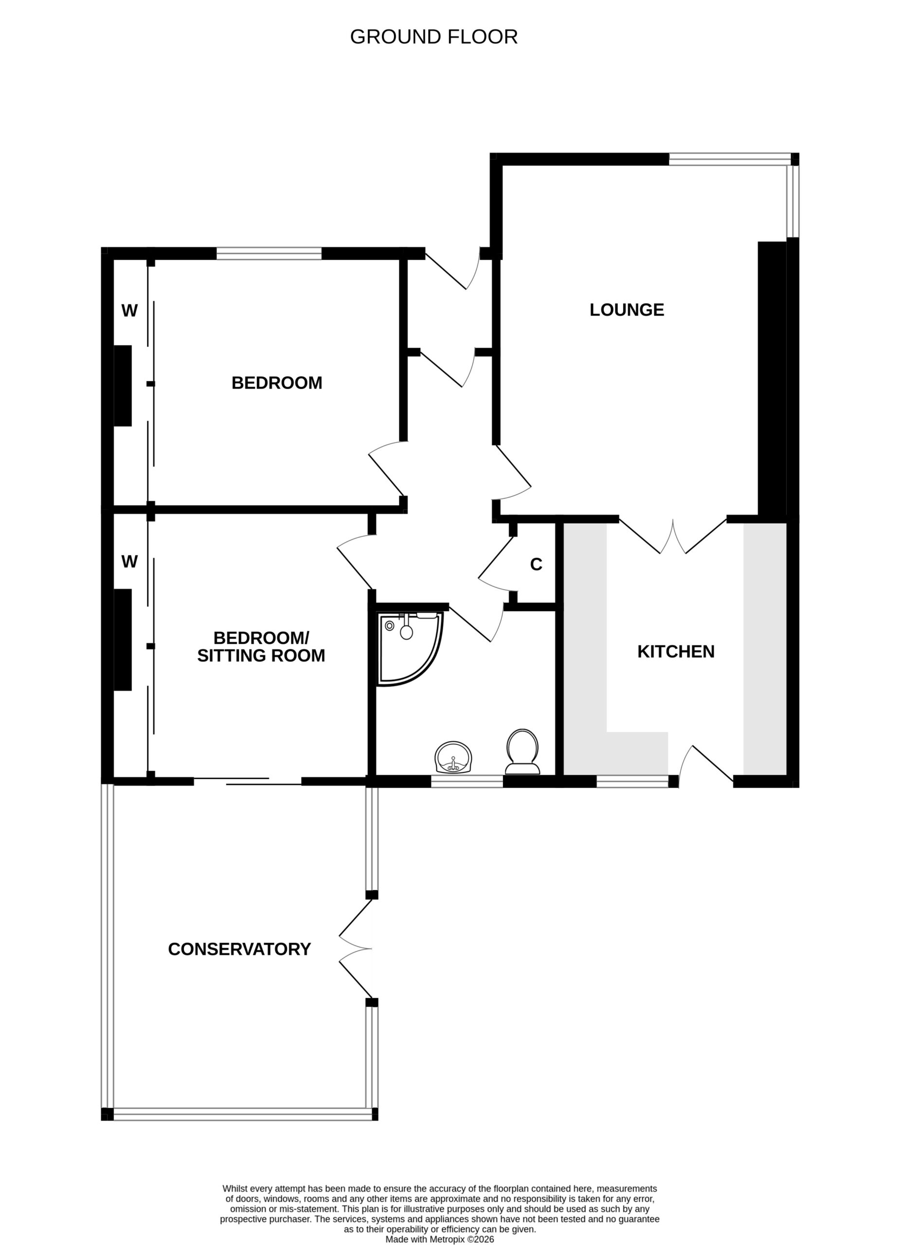 The accommodation comprises; entrance vestibule into spacious hallway, bright lounge offering comfortable living space with wall mounted feature gas fire and French doors to the kitchen area. The kitchen is fitted with modern wall and base mounted units, integrated fridge freezer, gas range cooker and washing machine, ample space for dining table and chairs, UPVC door to rear garden. There are two double bedrooms, one located to the front of the property and the other to the rear with sliding patio doors leading to the conservatory. The rear bedroom can also be used as a sitting room or dining room. Both bedrooms benefit from fitted wardrobes. Large conservatory with French doors leading onto the enclosed rear garden. The shower-