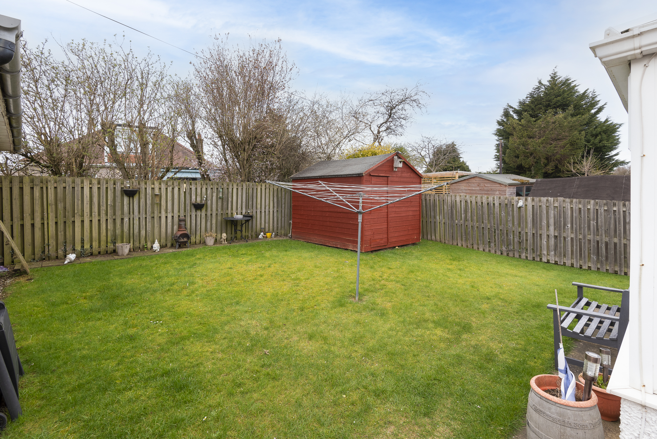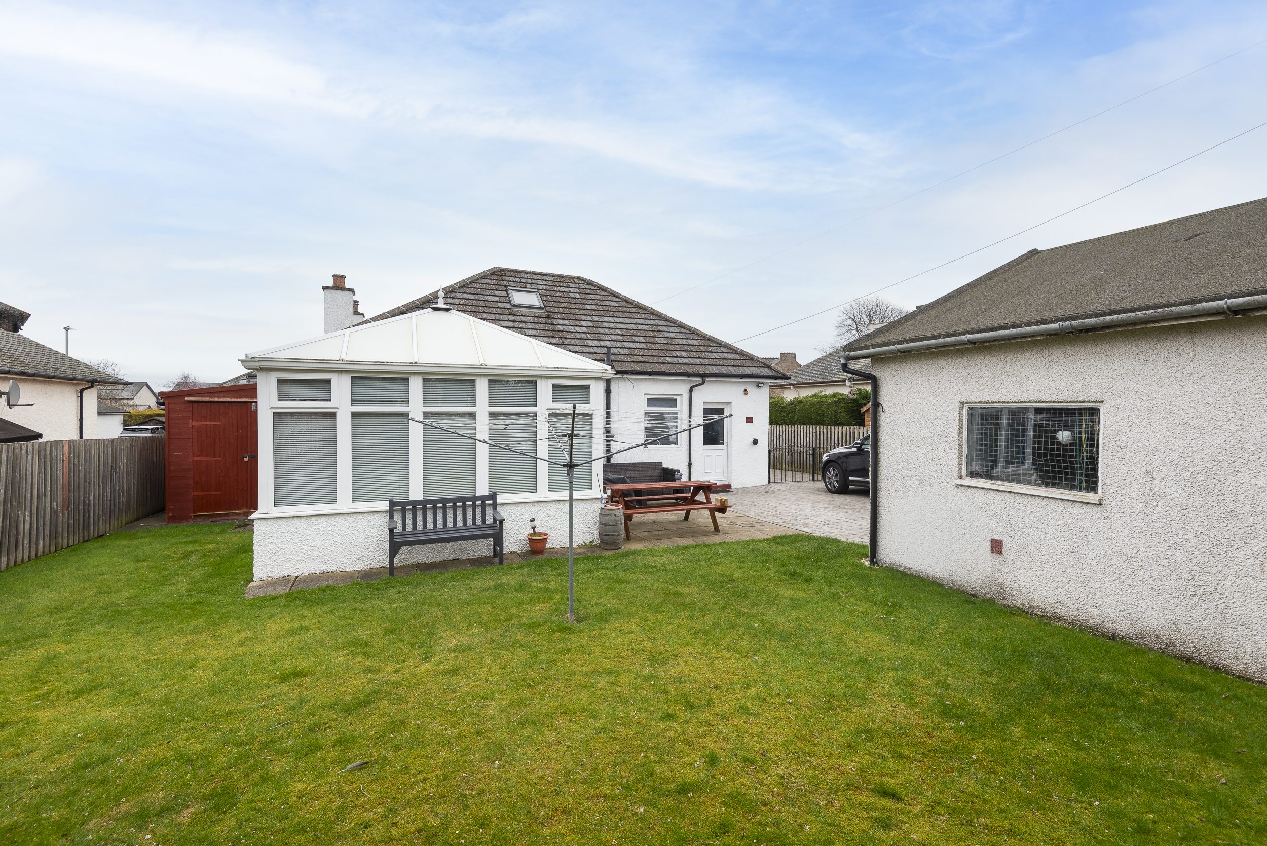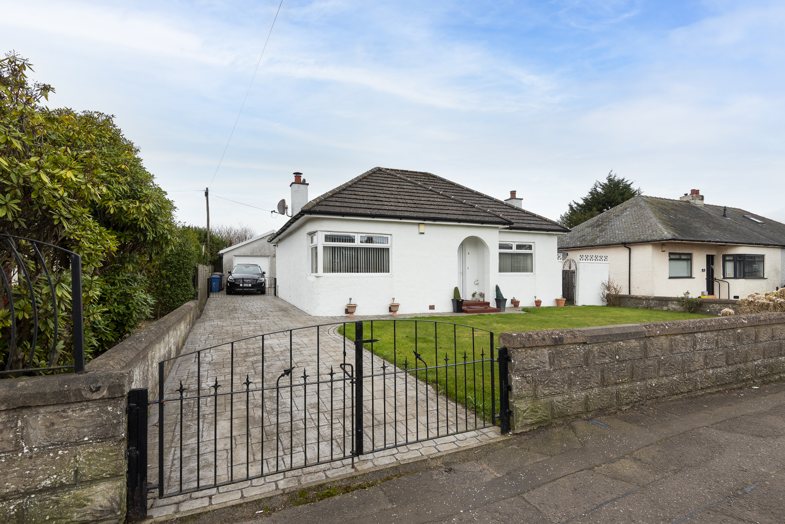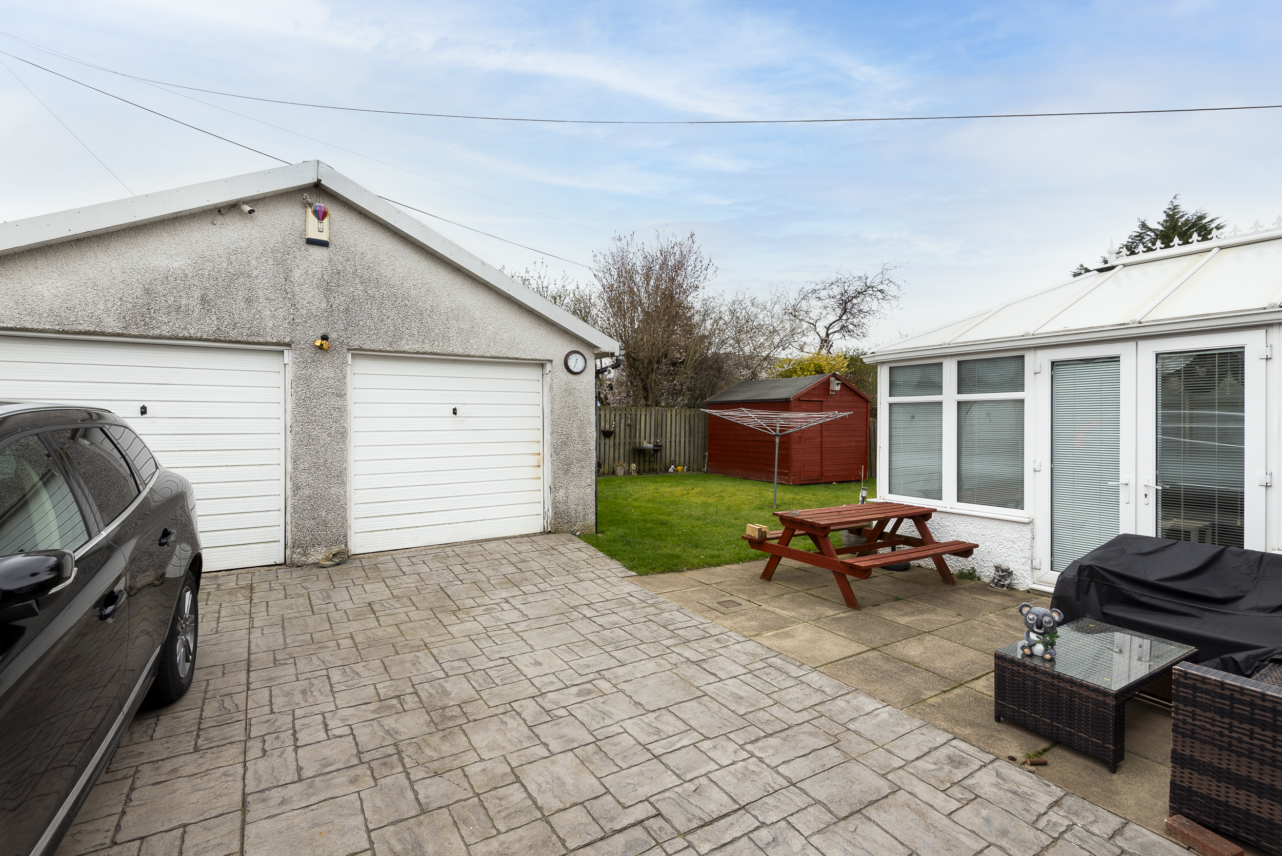 Private garden grounds are located to the front, side and rear elevations, incorporating a patterned concrete driveway providing off-street parking. Gardens are laid in grass, with a paved patio at the rear and areas of mature shrubbery. Double Garage.