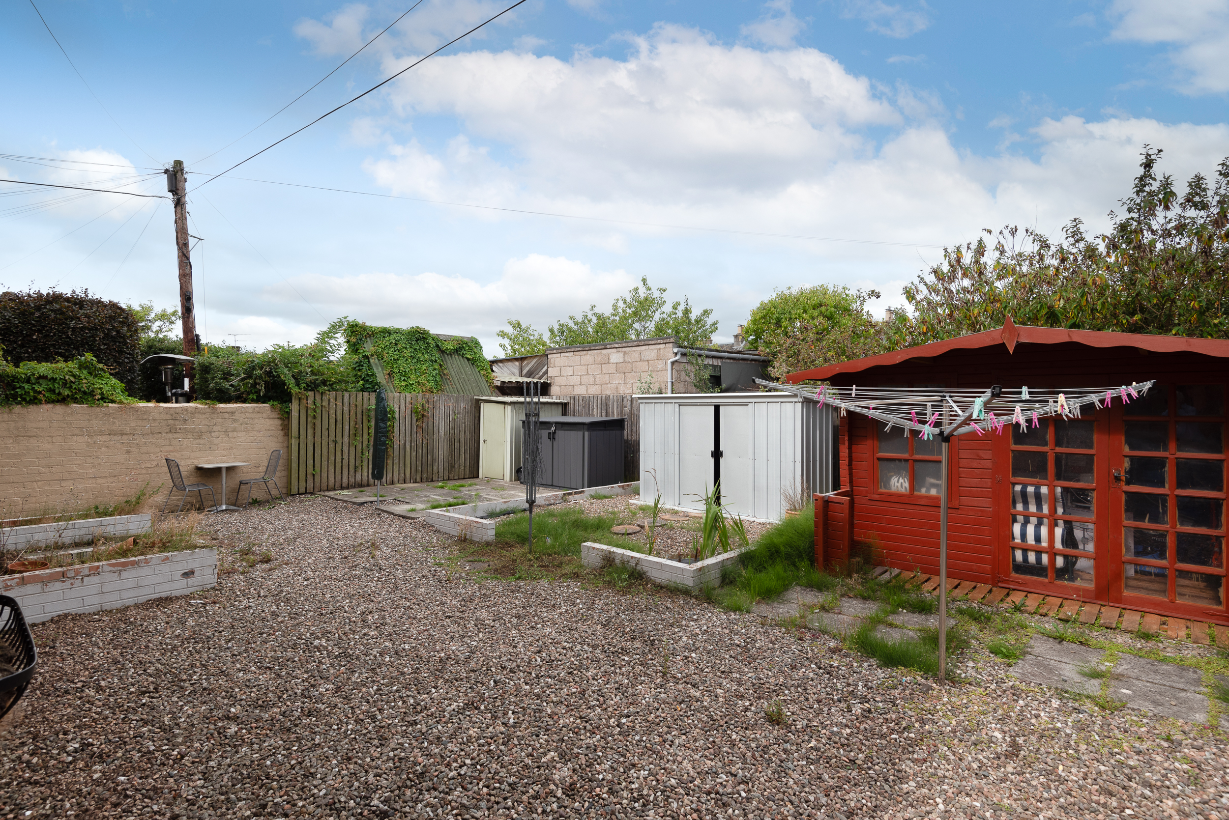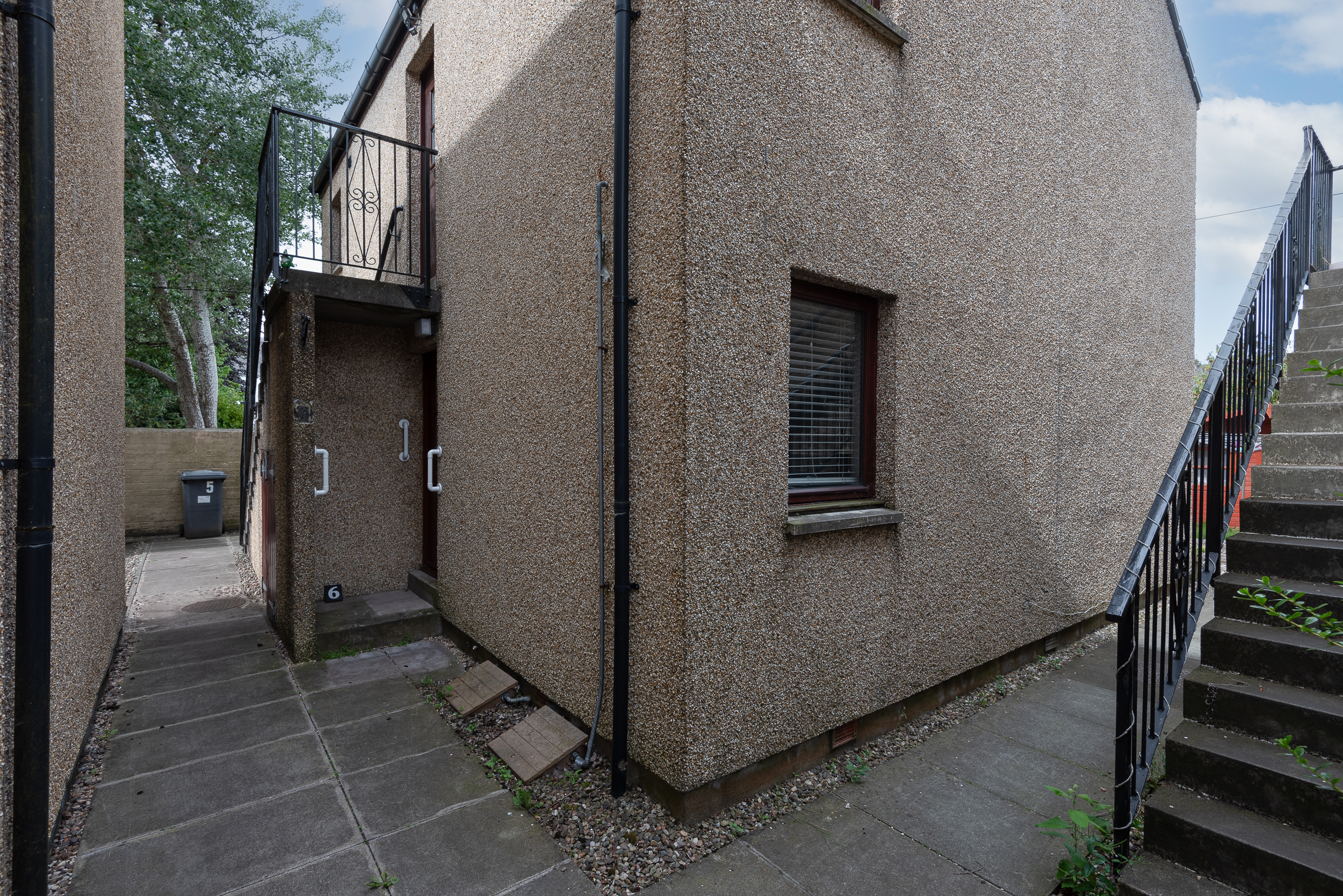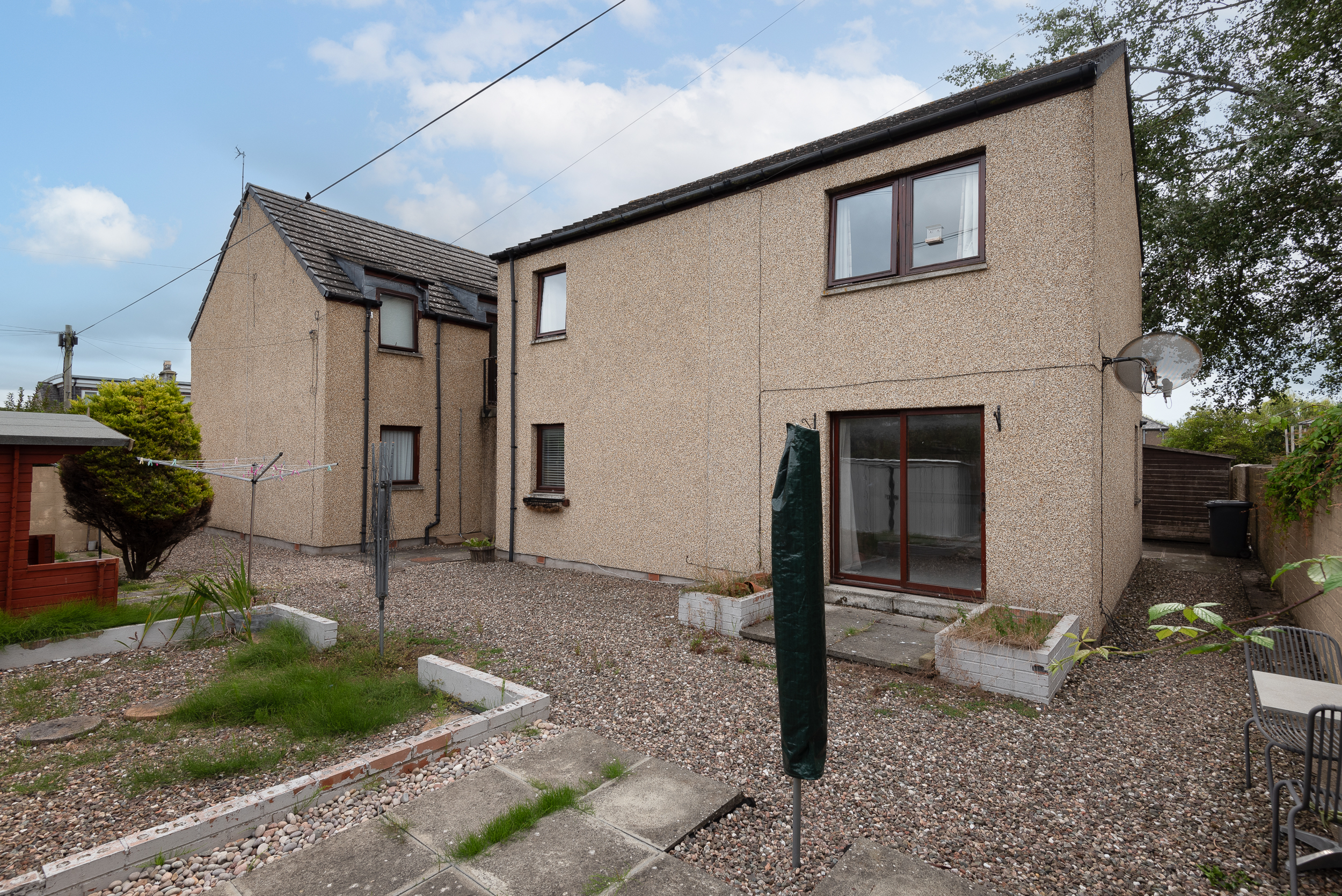 To the rear of the flat is a small patio and a separate plot laid in chips. Mutual bin store under the external stair and a metal shed.
